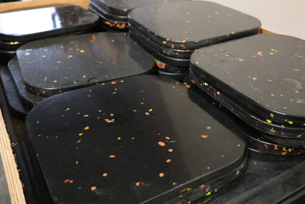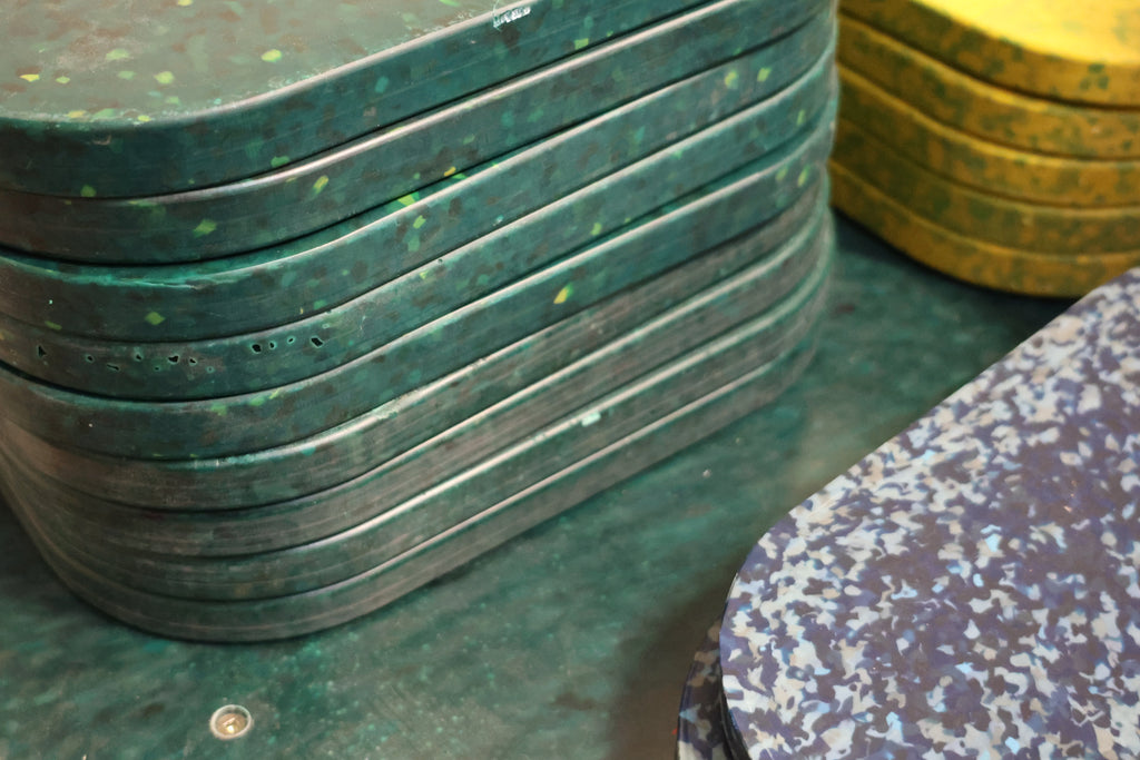 In our Victoria, BC workshop, we compression mold plastic into solid sheets and shaped forms using heat and pressure. This process creates strong, durable surfaces without the need for dyes, glues, or fillers. The colors and patterns in each piece come directly from the source material, which means no two are exactly alike.
